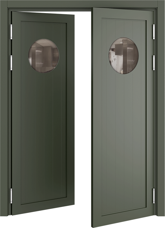 Барные двери актуальны в помещениях с повышенной проходимостью для более удобного доступа персонала к техническим комнатам, например с бара в зону кухни. Часто бывает необходимым, для обзора соседнего помещения, чтобы дверь была остекленная и стилистически оформлена. Стекло толщиной 4 мм круглой, овальной или квадратной формы, на выбор: сатинат светлый, бронзовый, графит или прозрачное стекло. Устанавливается на двери толщиной 40 мм в покрытии Эмаль (любой цвет по каталогу RAL Classic K7) и толщиной 35 мм в ПВХ-покрытиях.